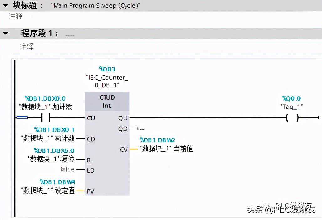 第二步:(在DB数据块填写地址,这里使用加减计数器指令CTUD)