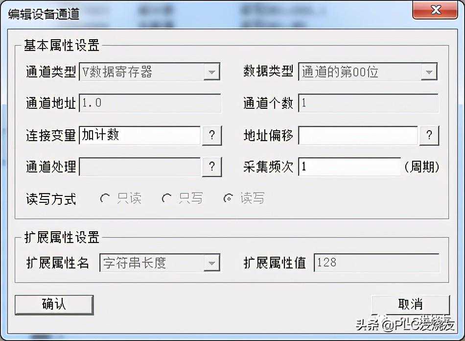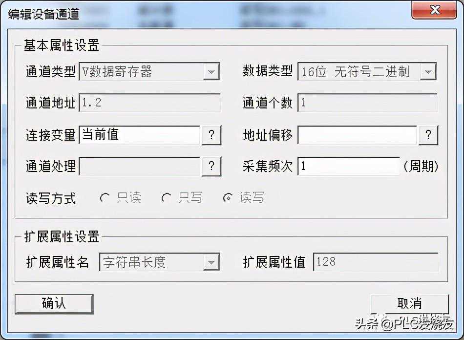 温馨提醒:MCGS中V寄存器对应:DB,通道地址1.0中的1代表DB1,.0代表X0,数据类型代表中的1。