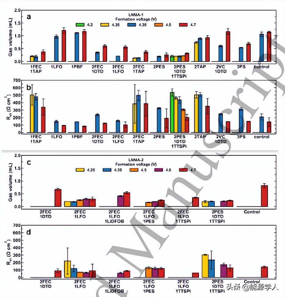 图6.在40°C下添加各种电解质添加剂在LNMA-1(a,b)和LNMA-2(c,d)电池化成至各种上限截止电压后测量的非原位气体体积(a,c)和电荷转移电阻(c,d)。