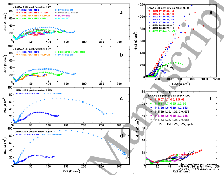 图7显示了化成后记录的具有各种添加剂的LNMA-2电池的EIS光谱(7a–d)和经过长期循环后选择的具有2FEC+1LFO的电池(7e和7f)。PES-211电解质在所有化成电压下都会导致最高阻抗,而2FEC+1LFO的阻抗谱受不同化成截止电压的影响最小。图7显示Rct随着化成电压的增加而降低,并且这种趋势在循环后反转(图7e和7f)。循环到高于4.44V的上限截止电压的电池显示出比循环到较低截止电压的电池高得多的阻抗值。