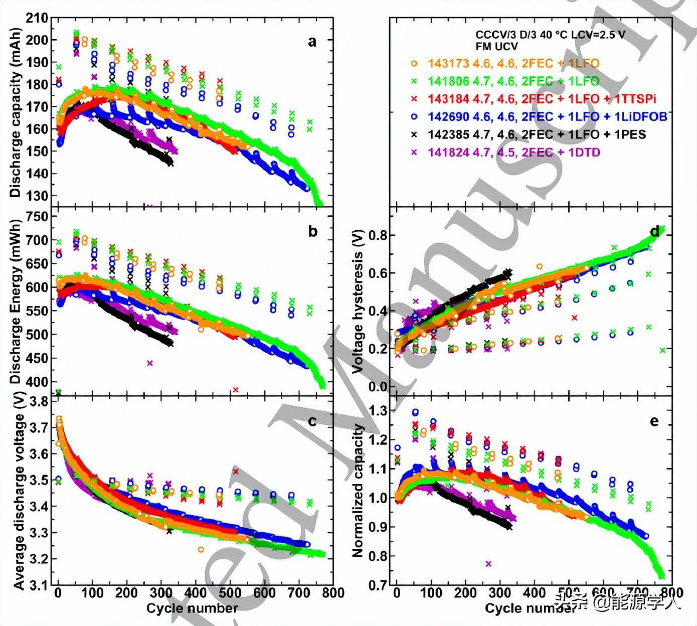 (2)基于2FEC+1LFO的电解质(除了2FEC+1LFO+1TTSPi)和基于PES的添加剂导致非常少的放气(1mLAh-1)并且可以实现1200次循环寿命;