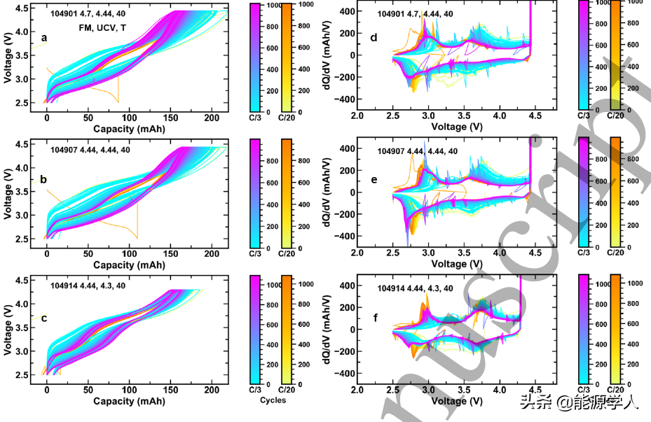 图17.LNMC1电池在40°C下循环至各种上限截止电压的(a–c)电压与容量曲线;(d–f)dQ/dV与电压曲线。