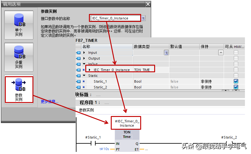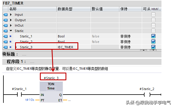 (2)FB的静态变量中新建IEC_TIMER等类型变量(LAD/FBD)