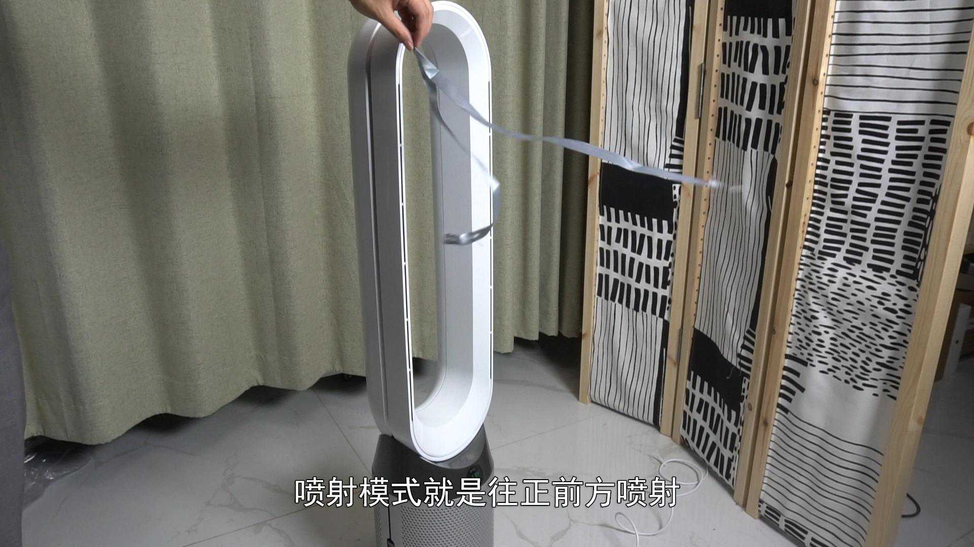 风力从机器的上部喷射而出,戴森TP04吹风有喷射模式和扩散模式,扩散模式就是从机器中间位置出风,风力会小一点,喷射模式就是往正前方喷射,夏季想要凉快一些就是实用喷射模式,而扩散模式主要用于冬季空气净化。