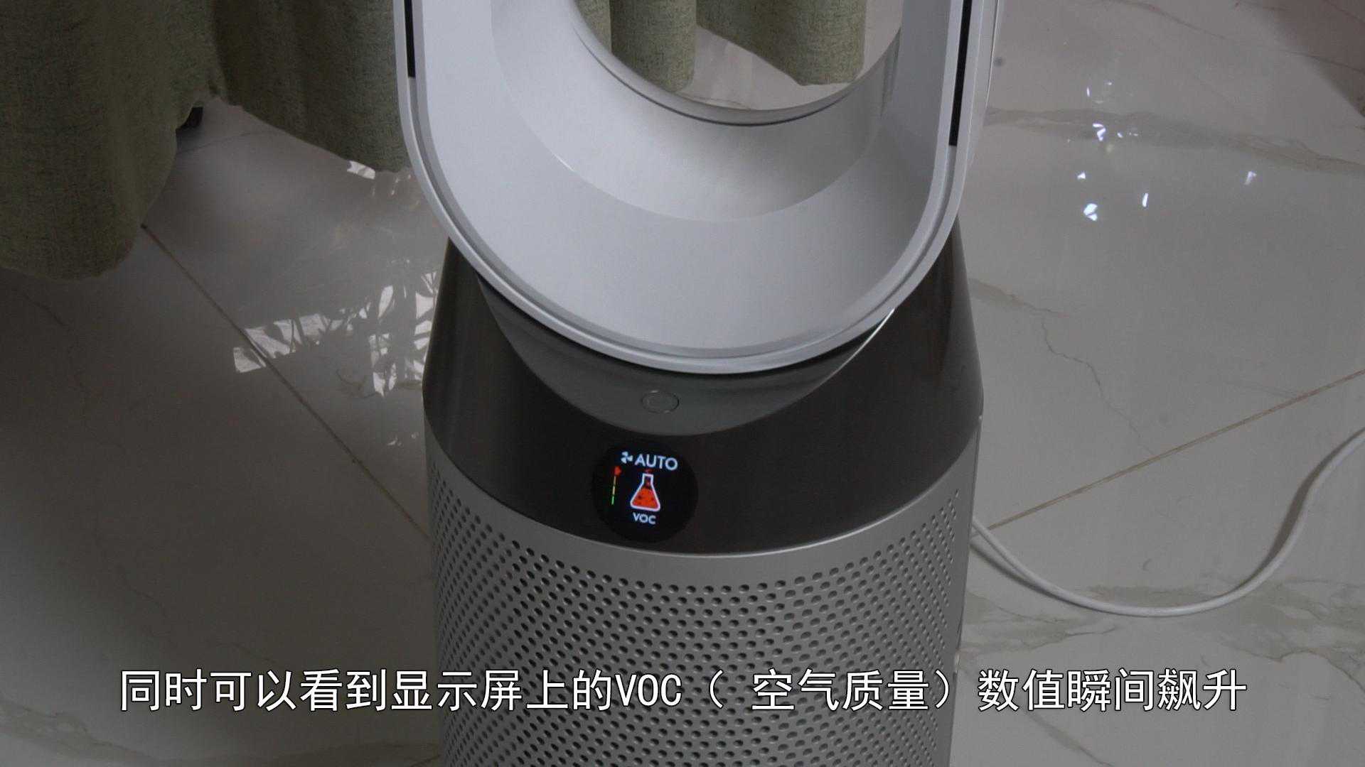 短短几秒钟,机器就迅速做出了反应,风力自动调到很大!同时也可以看到显示屏上VOC(空气质量)数据瞬间飙升。