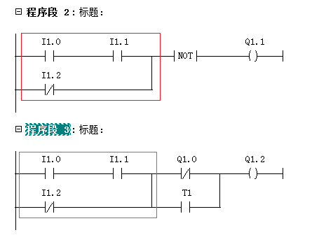 图中的红、蓝框中的逻辑完全一致,除了会带来额外的编程劳动外,没有任何意义。恰当、合理的运用"中线输出元件",可大大节约编程的劳动成本,如图3.2所示。