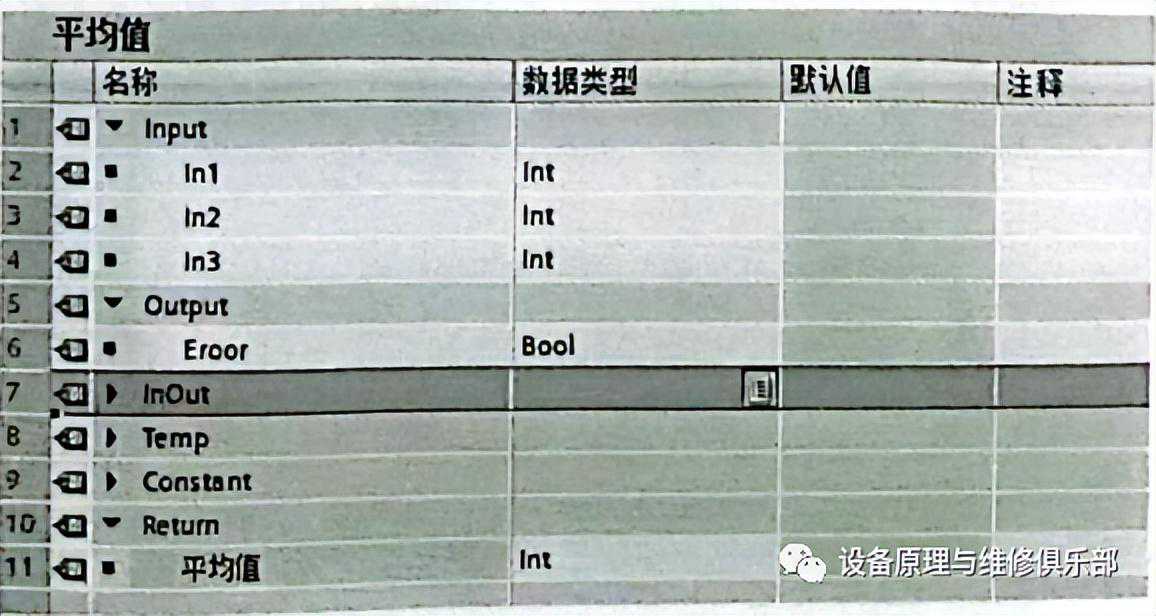 ③创建函数FC1。打开FC1,并在参数表中,输入输入参数“In1”、“In2”和“In3”,输入输出参数“Error”,如图3所示。在程序编辑区,写入如图4所示的程序。注意:本例中的平均值就是返回值。