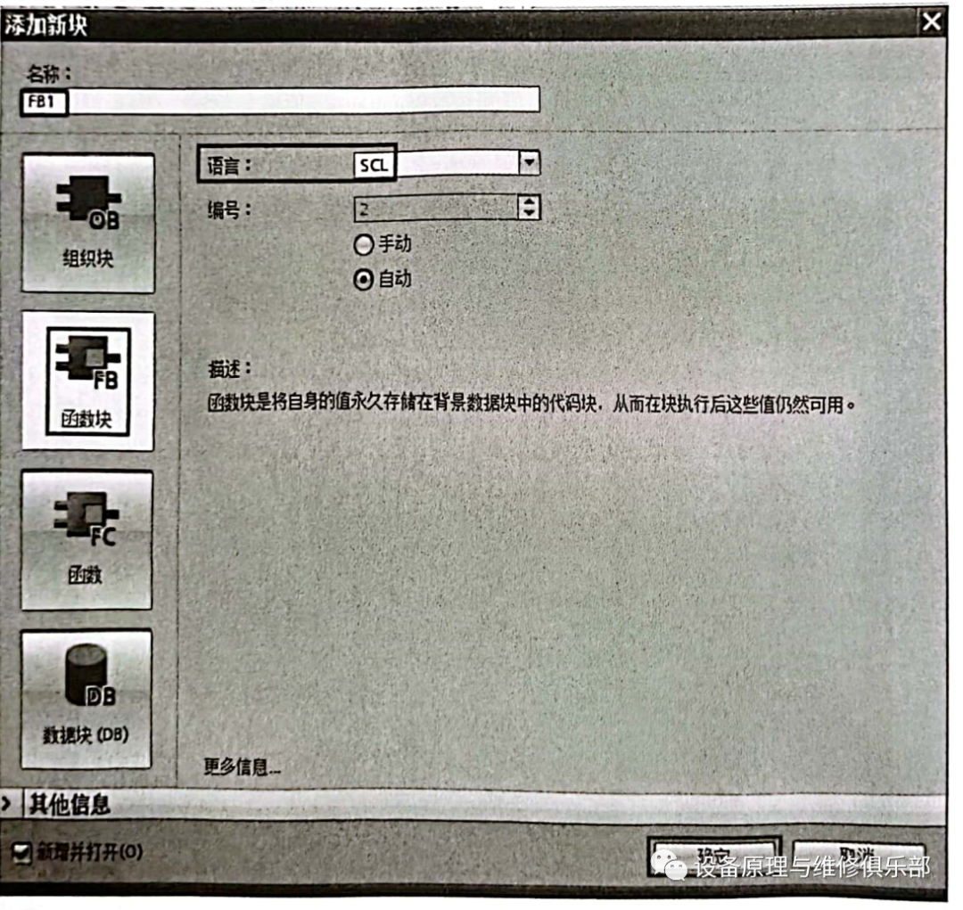 【解】①新建项目。新建一个项目“平均值”,在博途项目视图的项目树中,单击“添加新块”,新建程序块,把编程语言,选中为“SCL”,再单击“确定”按钮,如图1所示,即可生成函数“平均值”,其编程语言为SCL。