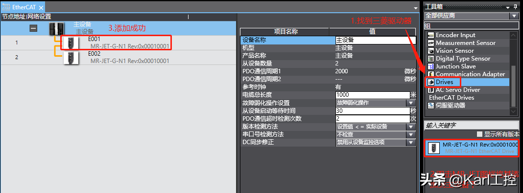 注:如果找不到三菱伺服驱动器,说明你没有安装它的XML文件,需要找供应商将MR-JET的XML文件给你,软件中手动安装即可。