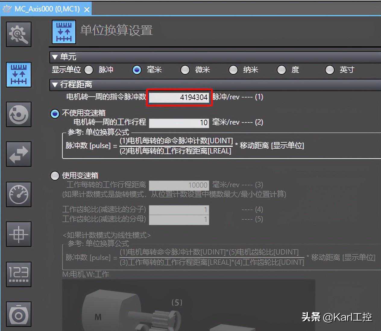 电机转一周的指令脉冲数:填写伺服电机编码器分辨率。例如22位编码器的分辨率是4194304,这里就填4194304