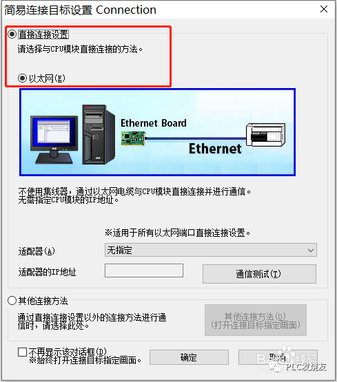 第三步:在“连接目标指定Connection”画面中,勾选直接连接设置、以太网