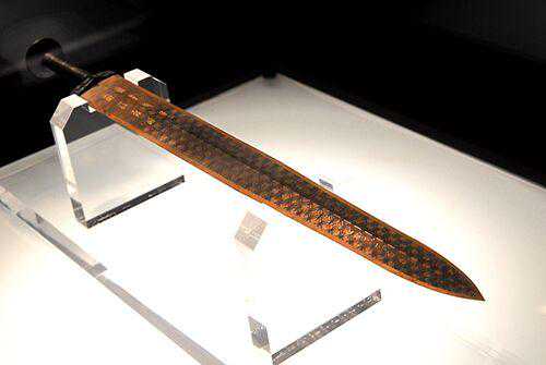 在这柄铜剑上,铸剑师采用了最上乘的材料,在没有实战价值的地方仔细打磨。剑身用锡金属熨烫出菱形花纹,剑柄镶嵌绿松石,底部的十一个同心圆整齐排列,让两千年后的数控技术都为之汗颜。月光银和土豪金交错相间的菱格花纹,嵌以湛蓝剔透的琉璃,缀以光洁碧绿的绿松石,剑柄势必也不是这样光秃秃的样子,定然曾饰以繁复精致的流苏玉佩,光是臆想,就该是怎样一副奢华的景象。