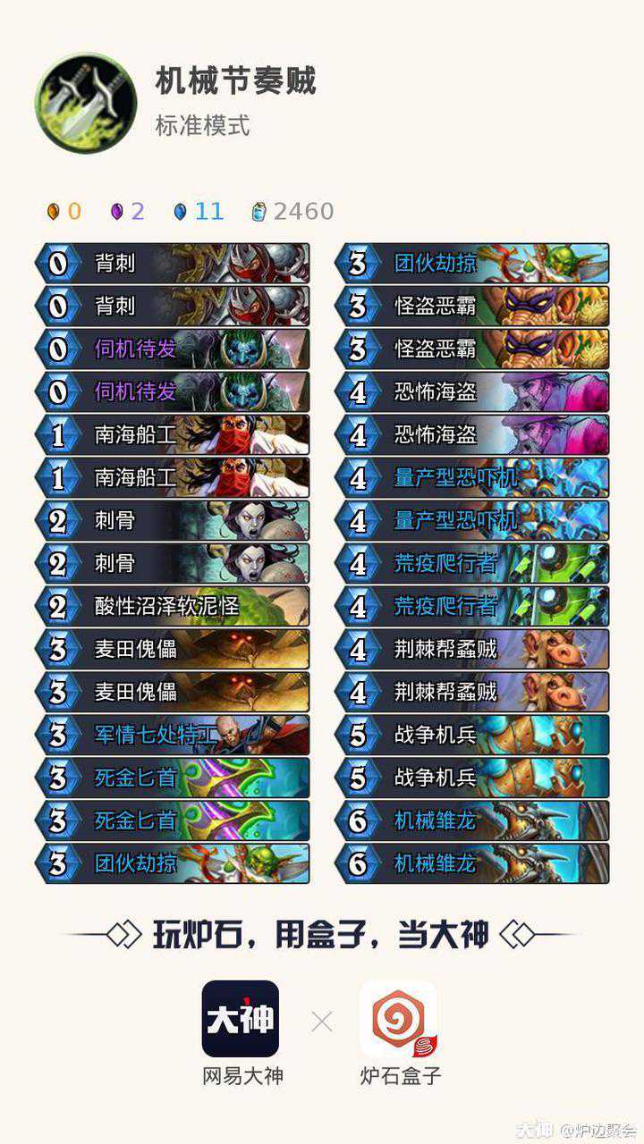 在构筑上相当于在传统节奏贼的基础上去掉了闷棍、毒药、大范、火车王等功能牌,换成了麦田、机械雏龙、战争机兵等机械亡语生物。这样的构筑让我们中期站场、输出能力更强,亡语生物还能与死金刀有很好的配合(间接不怕被软)。同时法术牌的减少也让我们这套操作空间降低了,更便于入手。