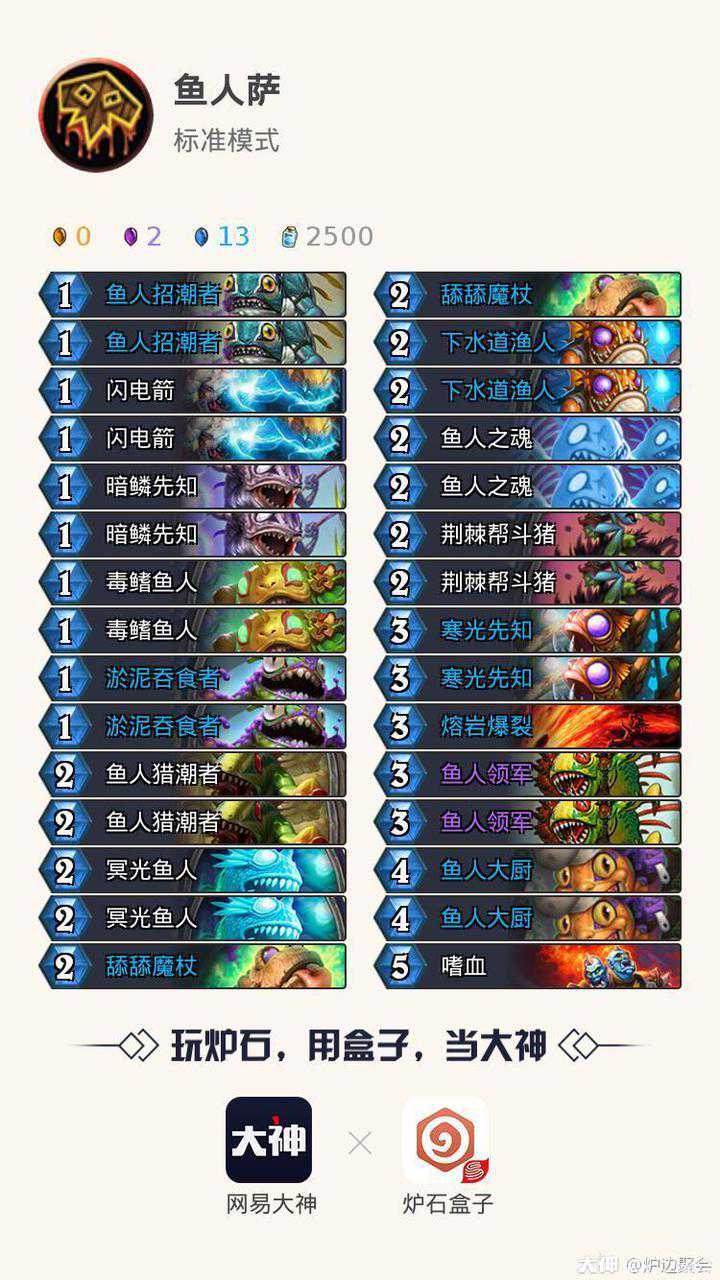 卡组解析:传统的一套鱼人萨,看似都是不起眼的低费鱼人随从,但是实战中滚起雪球来4-5费就能带走慢速卡组。