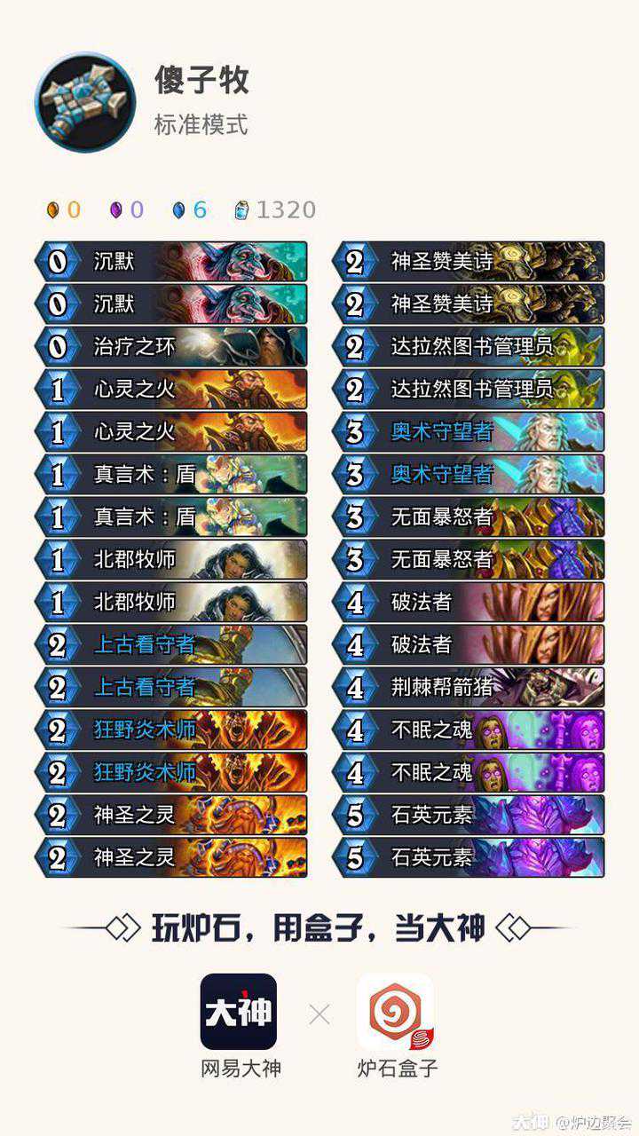 对局留牌:如上文所说任何对局必留傻子,有傻子考虑留沉默。对阵快攻卡组(动物园,鱼人萨)炎术士必留,有炎术士可以考虑留北郡、环、盾,前期憋一波挂机然后靠炎术士、盾、环配合北郡清场的同时还能过牌。对阵慢速就是尽可能找傻子随从与沉默,一般不要靠翻倍、心火获胜,起手不要留。