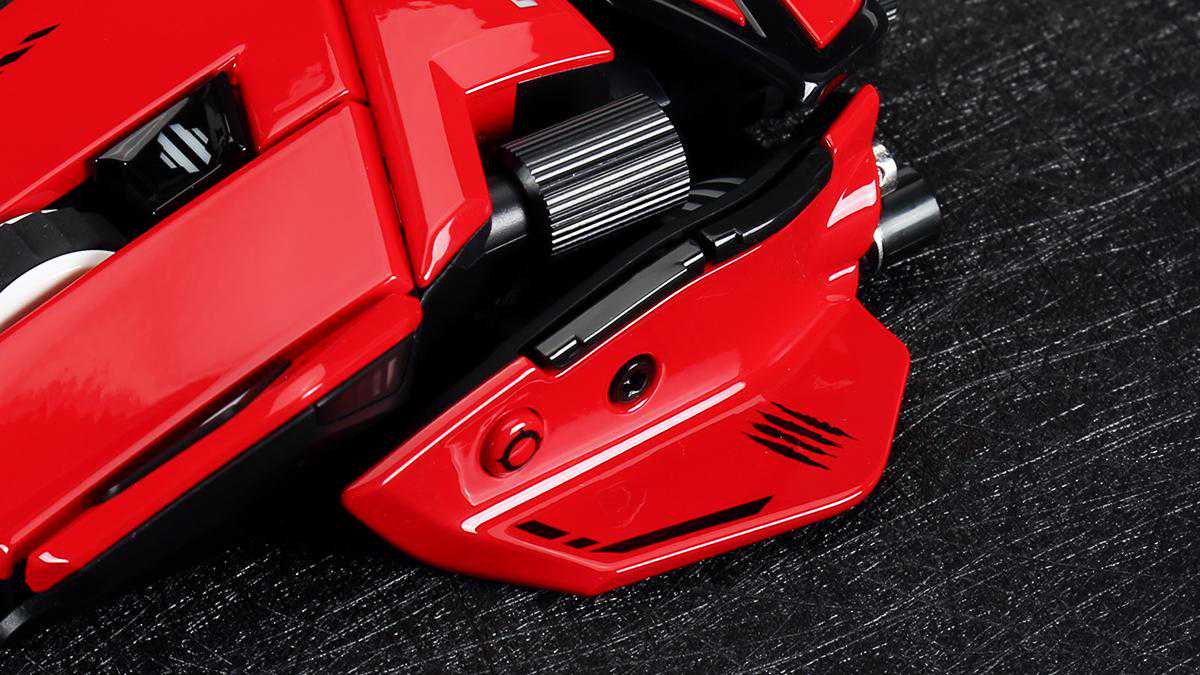 MadCatz(美加狮)RAT8+ADV游戏鼠标外观设计上延续了家族化的硬派风格,充满科技感的造型搭配红黑的撞色方案,也带来极高的辨识度表现。右手人体工学方案配合硬朗的机身线条,也营造出更为出众的视觉观感。机身表面采用红色镜面漆搭配黑色部件与纹饰,带来强烈视觉冲击感的同时,也有着更为丰富的视觉层次感,质感表现也非常出色。机身主体采用了大面积的红色镜面漆涂层,触感细腻光滑,温和舒适,也能为玩家带来更为舒适的握持手感。