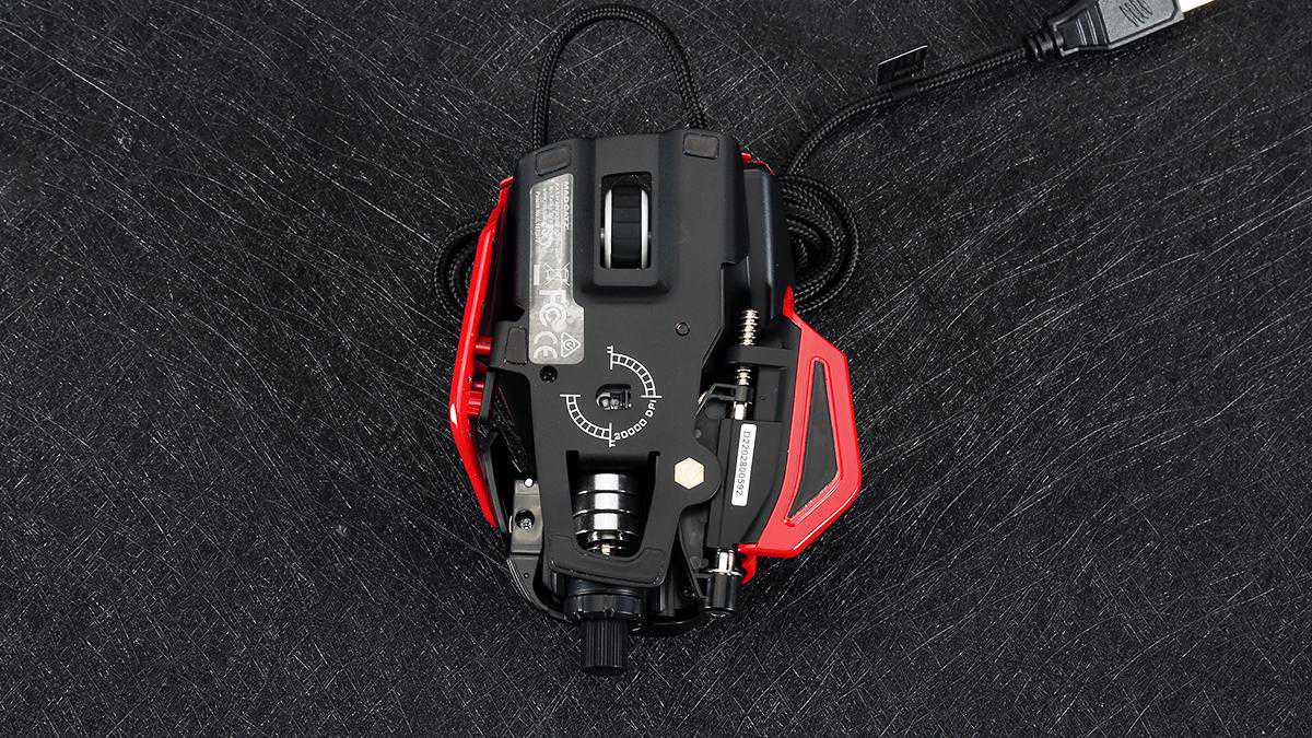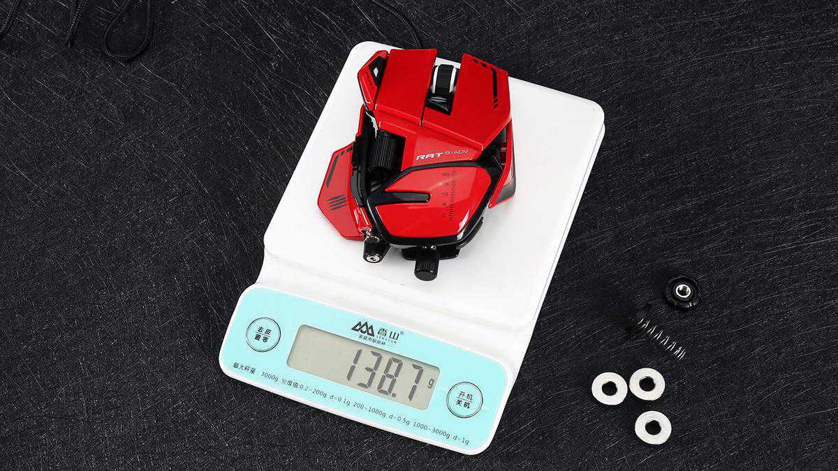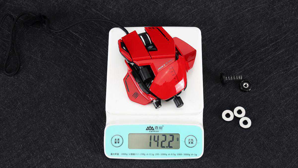 MadCatz(美加狮)RAT8+ADV游戏鼠标提供了配重调节,配合丰富的可替换部件,也让这款鼠标在重量上有着不同的表现。搭载全部配重状态下,机身重量约为158克,单枚配重约为6克,不加配重状态下,采用默认掌托及指托重量约为139克,更换加高掌托、加宽指托后重量约为142克。作为采用铝镁合金作为底部框架的游戏鼠标,这样的重量控制还是较为不错的。