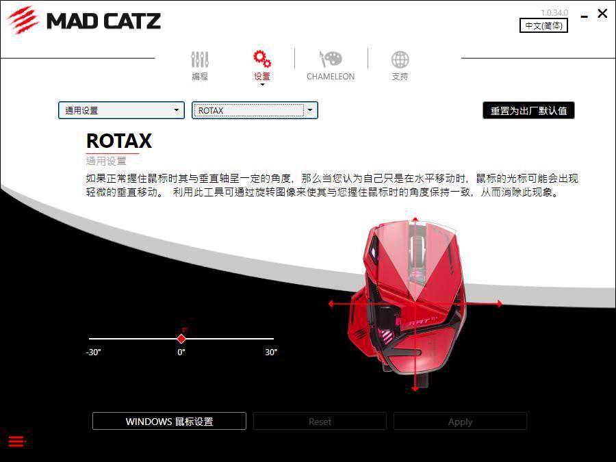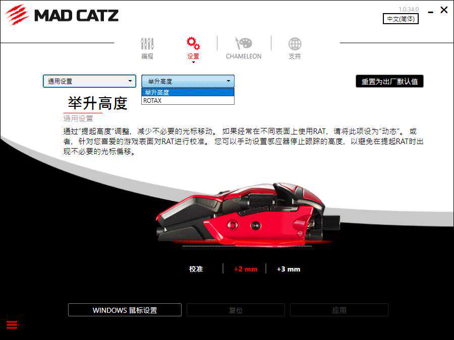 在设置界面,提供了配置文件设置、通用设置,以及鼠标DPI、回报率等设置选项,用户可以通过下拉菜单来进行选择调整。通用设置中提供了抬升高度调整,便于用户根据个人使用情况来进行调整。ROTAX则可以根据用户不同的握持习惯来进行调整,确保鼠标水平移动中不会向上或者向下偏移。