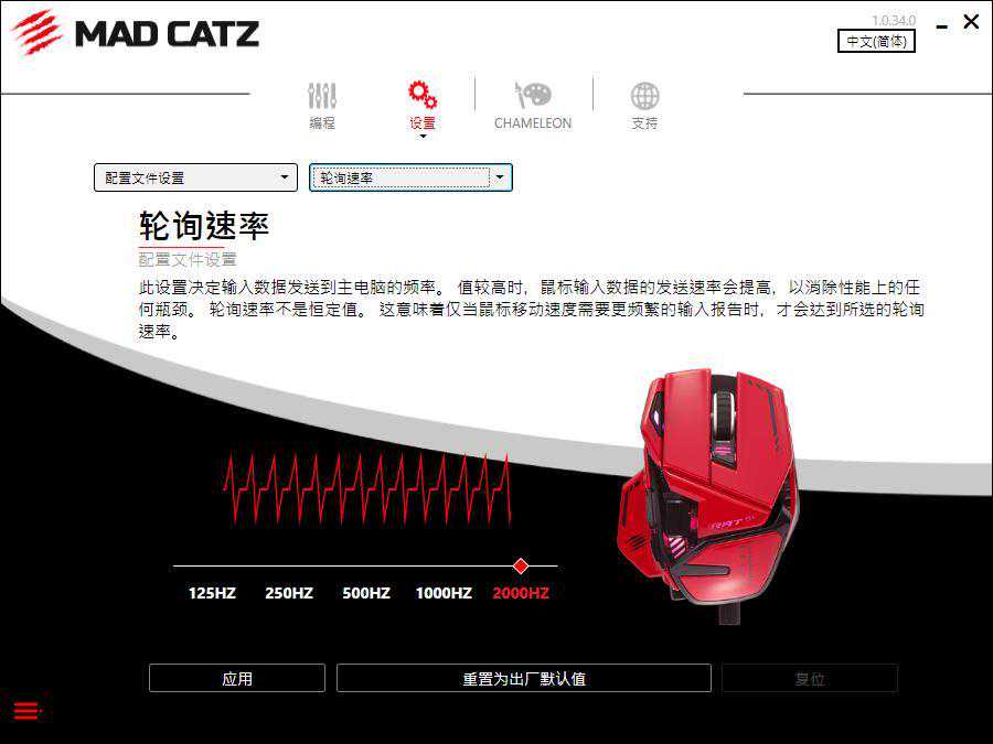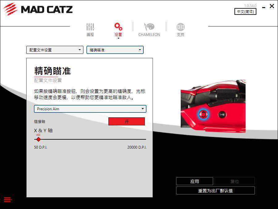 MadCatz(美加狮)也为这款鼠标编写了专用驱动软件,方便玩家对鼠标按键功能、性能参数、灯光效果进行设置。玩家可以对鼠标的11枚可编程按键进行自定义设置,驱动软件中也预置了非常丰富的功能选项,玩家仅需拖动功能到想要指定的按键上即可,同时支持玩家自行录制宏功能绑定到按键上使用。设置界面中,玩家可以对鼠标的参数性能进行调整,提供了非常丰富的调整选项供玩家设置。灯光界面中则是预置了多款不同灯效,方便玩家选择设置。