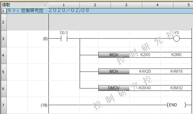 程序是这个接点接通的话,Y0输出点就会输出,后边同样是三个MOVE指令!第一个MOVE指令是实现将X0开始的一个字节传送到M0开始的一个字节中!第二个MOVE指令是实现将X20开始的2个字节也就是16位长度的值传送到M16开始的2个字节中!第三个MOVE指令是实现将X40开始的4个字节也就是长度32位的值传送到M32开始的4个字节中!