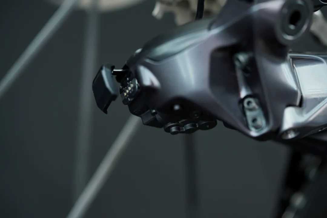 Shimano的新12s套件不能称之为真·无线电变的一个证据是:前后拨是要通过电线链接到电池上的,和FSAWE电变套件原理相似。不过相比过往几代Di2系统,新套件还是简化太多了。以前各种控制器、转接器、无线发射器,分分钟把你搞蒙圈;新套件把所有这些职能都交给后拨去完成了。单凭这一点,强迫症患者们就得冲12s而不是11s。有人要问了:为何把控制中心放在后拨而不是前拨呢?答案是:虽然后拨确实不经撞,但你得考虑单盘用户的感受吧。