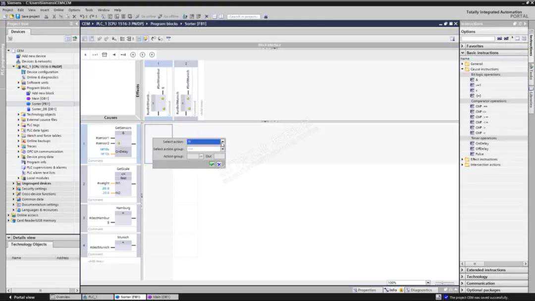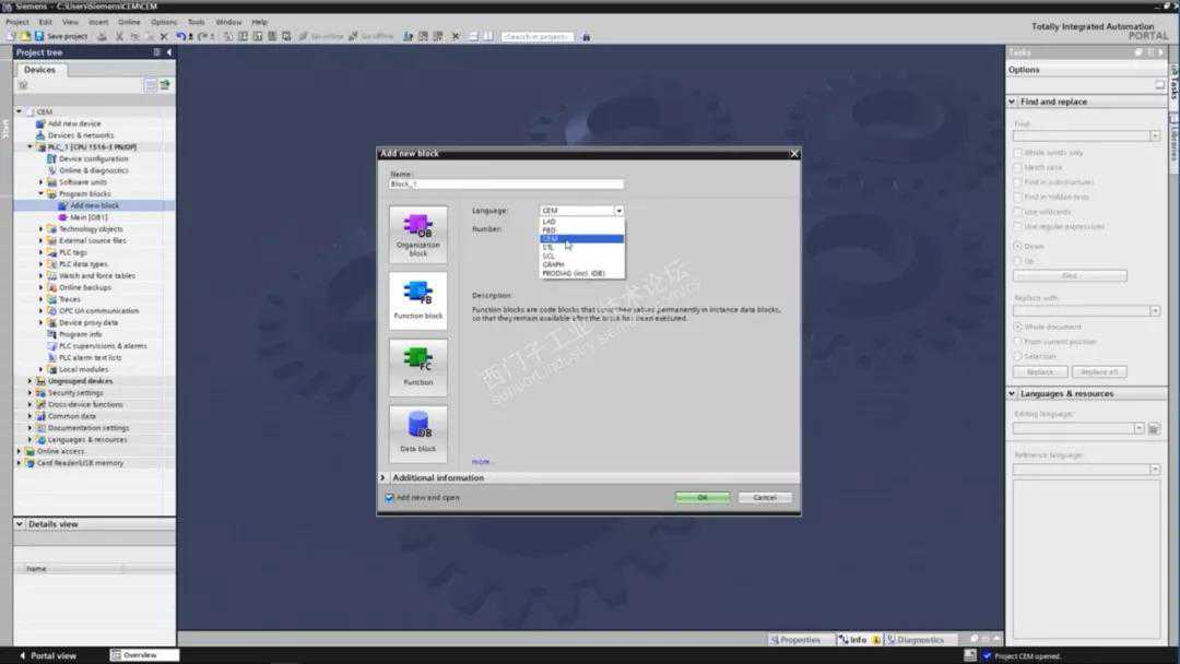 CFC和CEM连接的都是现成的函数和函数块,这种连接方式都是面向控制对象的,所以控制对象必须预先进行标准化的编程,也就是说在库中必须有不同对象的函数而且还要丰富,不知道在V17中是否会提供大量的控制对象的函数。