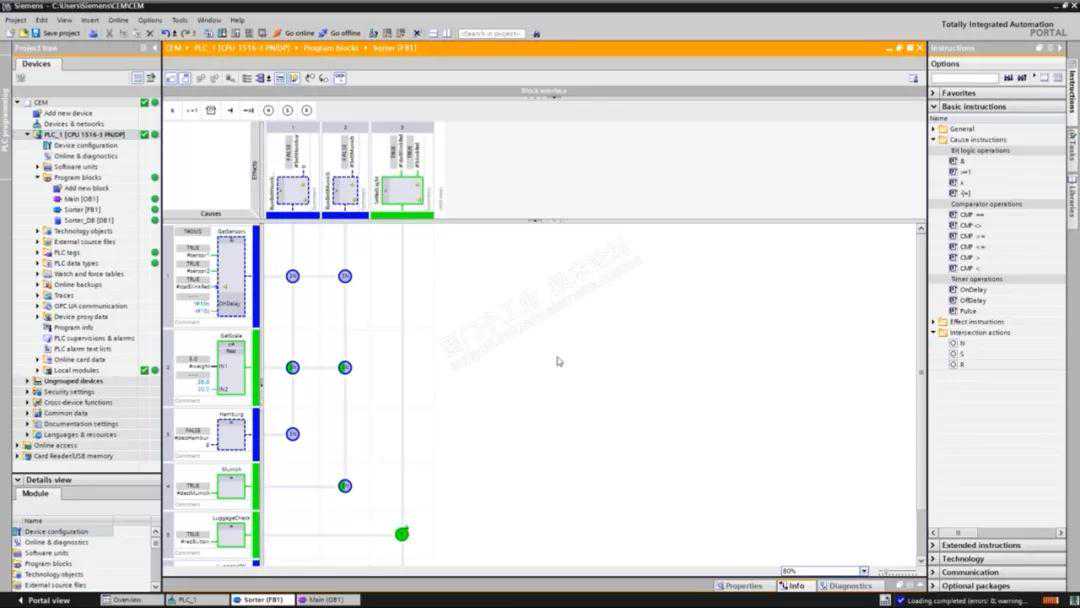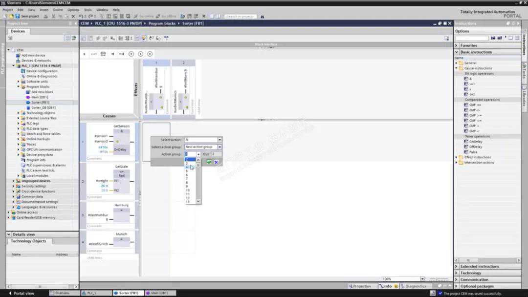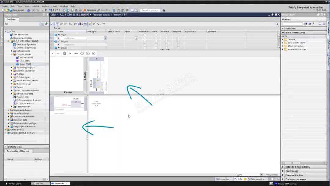 (1)新添加两个编辑器CFC和CME用于以图形化配置的方式设计控制程序。S7-1500支持CFC和CME编辑器,S7-1200支持CME编辑器。图形化的配置界面,可以使机器设备之间的逻辑关系简单明了,一目了然。这对于从事于过程控制的同学们是一个福音。CEM意为因果矩阵,连接不同的因,对应不同的果。使用一个矩阵,开发人员可以根据因果关系的原则配置模块之间的依赖关系。下面一起来看看CEM的基本风格和界面。