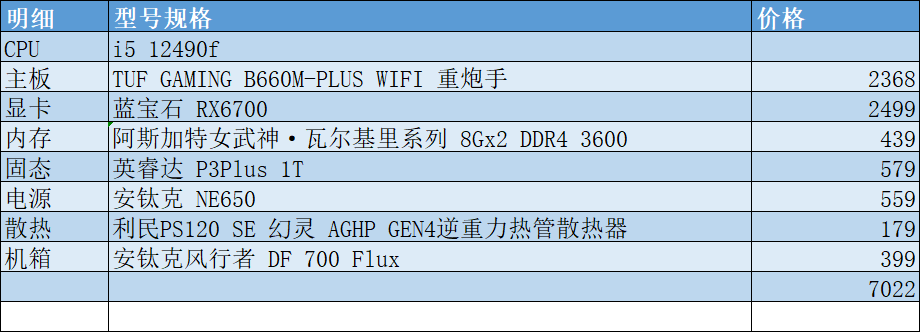 这个配置就可以2K开个中高画质玩3A了,价格比上一套要加1500块,这套里面的显卡是蓝宝石的RX6700,性能我测过,还是不错的