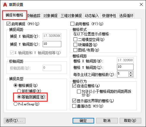 3.在弹出的“草图设置”对话框中选择“捕捉和栅格-捕捉类型-等轴测捕捉”,把“矩形捕捉”取消掉。