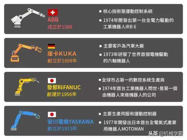 谈及世界工业机器人,就绕不开以发那科、库卡、ABB、安川电机为代表的四大家族,在亚洲市场,它们同样举足轻重,更占据有中国机器人产业70%以上的市场份额。那么,机器人四大家族的产品都有哪些各自的特点,优劣势分别是什么?