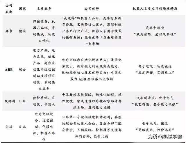 四大家族的起家皆是从事机器人产业链相关的业务,如ABB和安川电机从事电力设备电机业务,发那科研究数控系统,库卡最初从事焊接设备。最终他们能成为全球领先的综合型工业自动化企业,都是因为掌握了机器人本体及其核心零件的技术,并致力投入研究而最终实现了一体化发展。