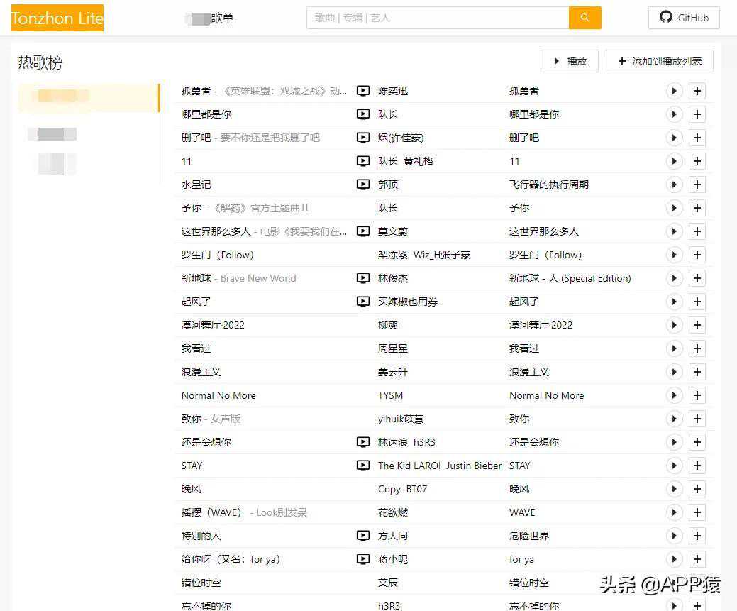 【TonzhonLite】,在线听歌神器,聚合互联网主流的音乐平台,可直接跳转对应的音乐平台听歌,这样有些平台因为无版权无法播放的歌曲不用不停切换到其它平台听。