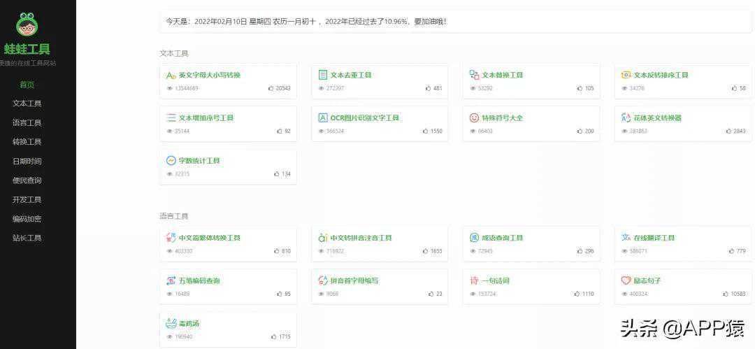 【蛙蛙在线工具箱】是一个聚合免费便捷在线工具网站,提供语言工具、文本工具、转换工具、编码解码、站长工具等便利的在线工具服务,支持的工具上百种了,非常适合平时从事互联网行业的用户收藏备用。