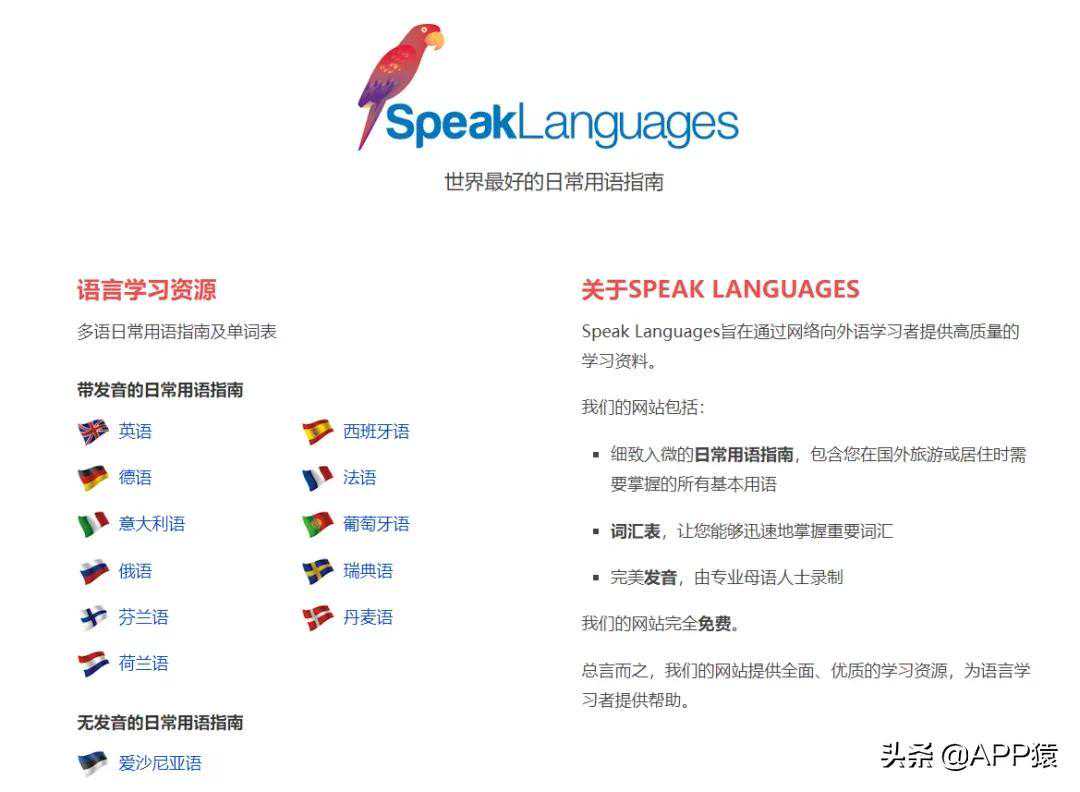 【SpeakLanguages】,一个极为优质的语言学习站点,支持众多语言的完美发音,由专业母语人士录制;丰富的词汇表,让您能够迅速地掌握重要词汇;另外还有日常用语指南,包含您在国外旅游或居住时需要掌握的所有基本用语。