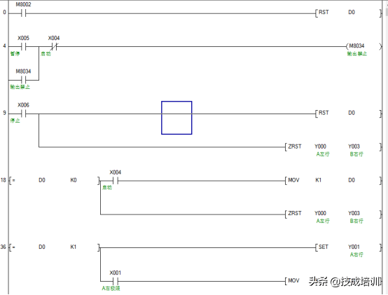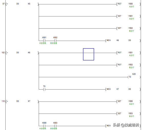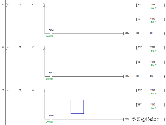 上图中的红色文字指的是步号,第一步是A右行,第二步是B左行,我们可以用一个数据寄存器D0对其动作进行记录,用MOV指令进行给定。比如按下X4按钮时,用mov指令给寄存器D0传送一个K1的数值,表示进入了第一步,这些。用等于指令,当D0等于1时,输出Y1的动作,让A平台右行。