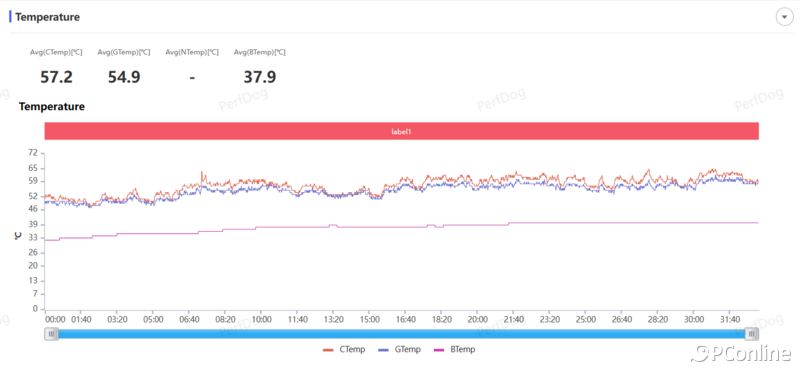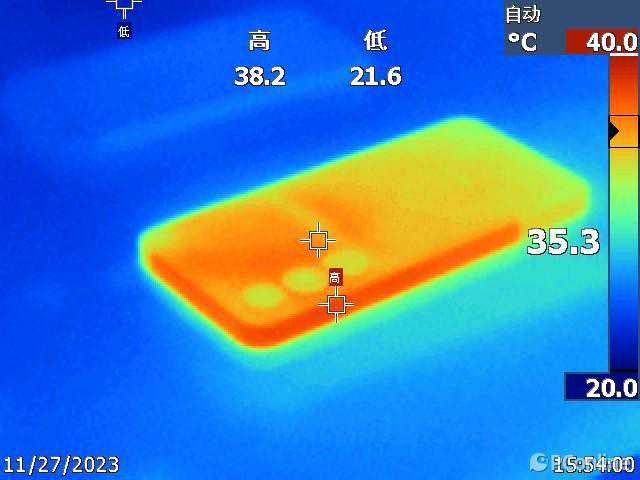 通过热成像仪可以看到,魅族21的热量散发路径非常明显,充分利用了铝合金中框导热快的优势,通过均热板将热量引导至中框,再用中框与空气接触进行热传递。机身下半部分几乎不会受到影响,电池被Soc加热的情况减缓了很多,查看传感器数据显示,半小时原神测试后电池平均温度只有37.9℃。