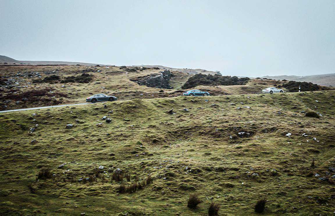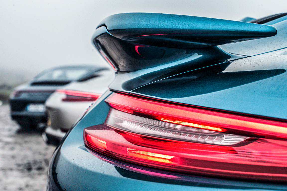 太可惜了,这石墨蓝的金属漆在无穷无尽的灰色天空下显得黯然无光,在正常条件下它可是个精美的尤物——水晶剔透下透露着肌肉的力量——流畅的车体,但是暗色的字体、排气和轮圈又闪烁着一点点的坏。在这台相对均衡的C4S旁边,GTS车身上一些小东西以及低趴的姿势则让它看起来有点不同。旁边这台有尾翼的Turbo同样消失在了迷雾之中。在面对其他15万英镑左右超级跑车的时候:奥迪R8V10,本田NSX或者迈凯伦570S等等,TurboS这台车显得有些弱,但是在整个911系列里,它还是属于领头羊了。