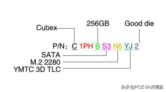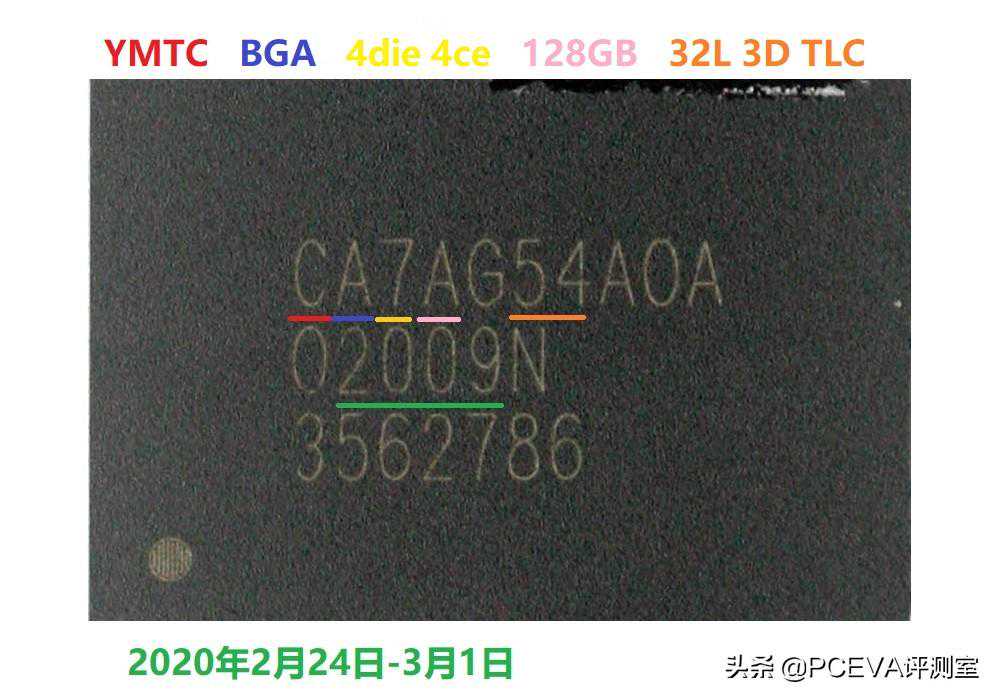 由于群联只做方案提供商而不直接面对零售市场,所以颗粒编号规则从未公开。PCEVA通过收集整理到的信息进行如下解读:第一位是闪存制造商代码,C=YMTC长江存储;第二位是封装类型,A=BGA封装;第三位7代表4die4ce;第四位A代表单个颗粒容量128GB;第6-7位的54代表32层3DTLC。