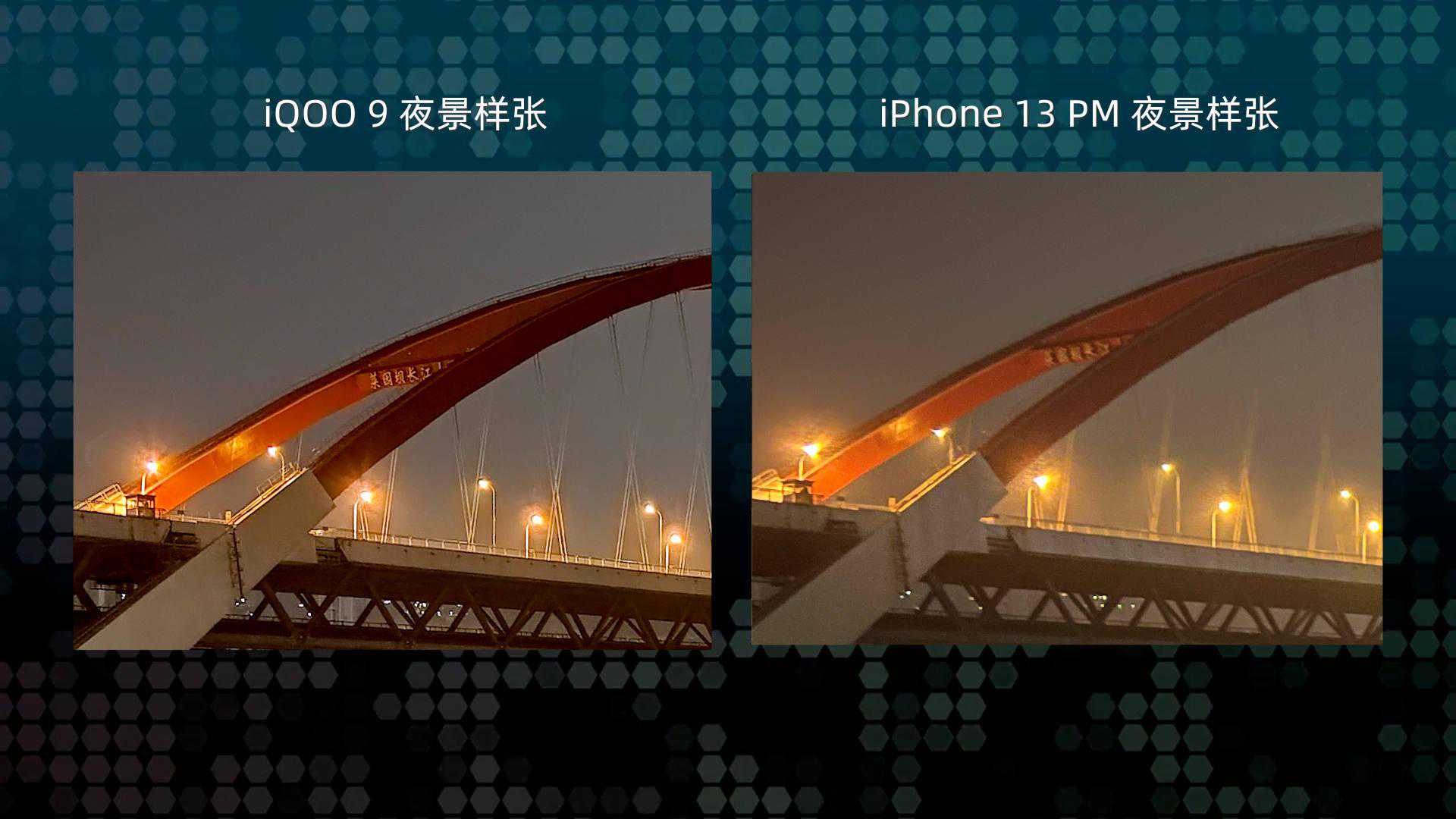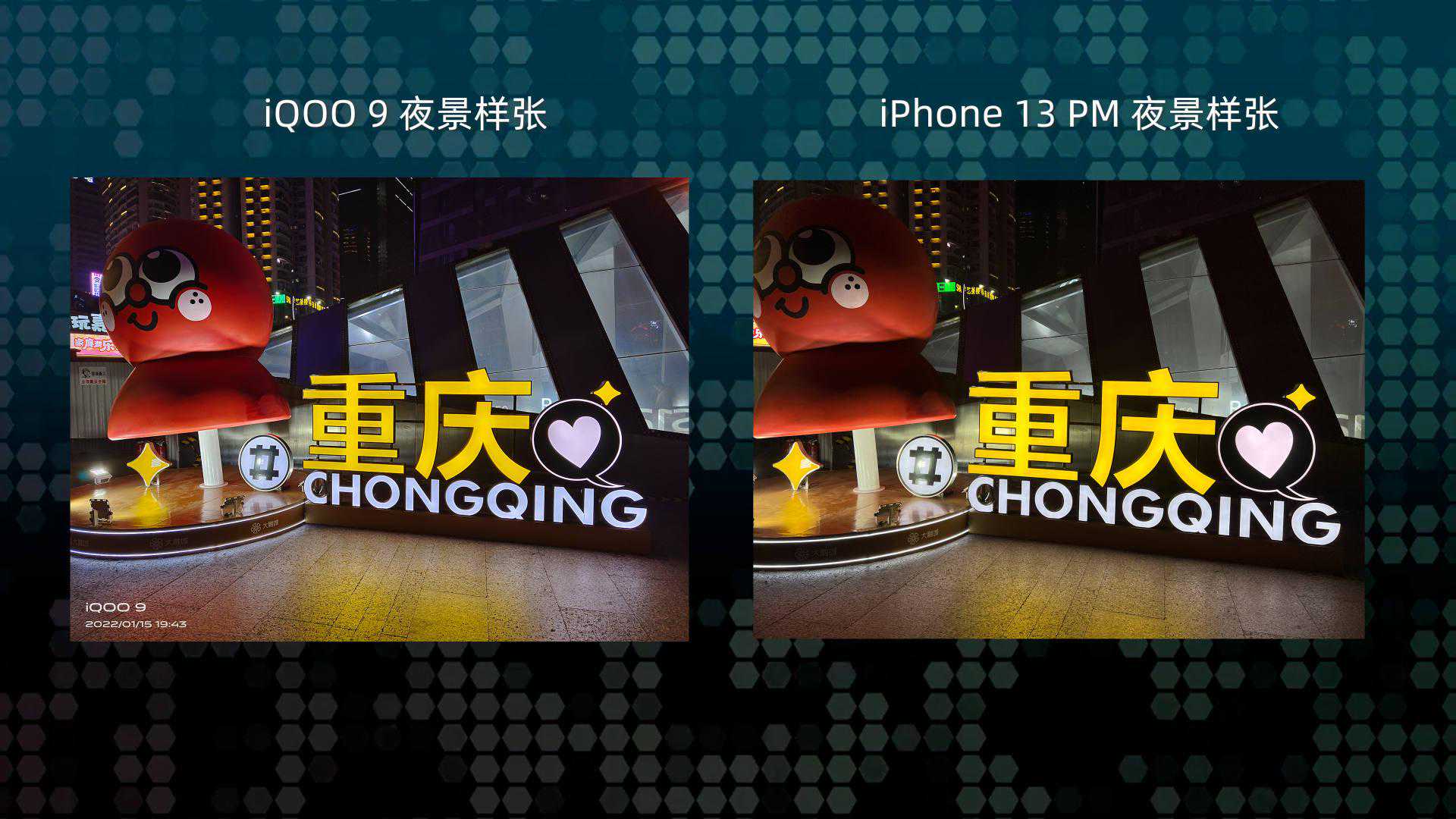 夜间拍摄上,在夜景模式加持下,即使是面对iPhone13Promax也没有差。能看到在对高光的压制上,以及对暗部细节的保留上,都能够很好的做到,所以我并没有为大家测试出来网传的iQOO9翻车的情况,可能是我们拿到的时候完整的影像固件已经更新完成了吧。