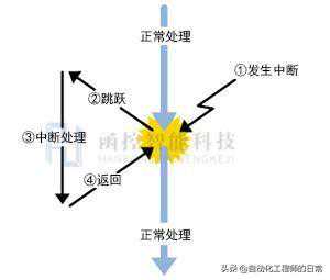 PLC中均内置有中断功能及脉冲捕捉功能。用于完成一些特定的功能应用。如,信号捕捉;编码器信号中断、脉冲测量中断等。程序中断时不受顺控程序(主程序)的运算周期的影响,将中断源信号作为触发信号,立即执行中断程序(中断子程序)的功能。PLC的中断过程如下图所示: