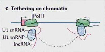 这些发现提供了lncRNAs经常是核定位的见解,并表明功能性lncRNAs必须逃避这种核监视过程,才能在特定类型的细胞中高水平积累。然而,染色质栓系的lncRNAs可能并不总是核监测过程的目标。一些染色质定位的lncRNAs含有高水平的U1小核RNA结合位点,它们将U1小核核糖核蛋白(U1snRNP)招募到转录参与的PolII,导致许多非编码RNA与染色质相连(图1c)。