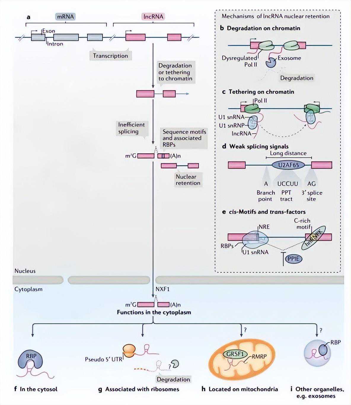 大部分lncRNAs被输出到细胞质中;这些lncRNAs可能与mRNAs具有相同的加工和输出途径。事实上,最近的一项研究表明,含有一个或只有几个外显子的长的和富含A/U的转录物依赖于NXF1途径进行输出。与mRNAs相比,lncRNAs的外显子较少,因此它们优先利用这种输出途径。到达细胞质后,lncRNAs可能经历特定的分类过程,将不同的lncRNAs分配给特定的细胞器或分布在细胞质中,并与不同的RNA结合蛋白(RBPs)相关(图1f)。