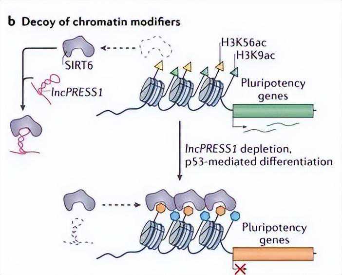最后,lncRNAs可以充当诱饵,而不是招募染色质修饰剂。p53调控的lncPRESS1是一种多能性相关的lncRNA,作为脱乙酰基酶sirtuin6的诱饵,抑制多种多能性基因,从而促进分化。在人类胚胎干细胞(HESC)中,lncPRESS与sirtuin6相互作用,并将其从染色质中分离,从而在Lys56(H3K56ac)和H3K9ac处维持多能性相关基因的转录允许H3乙酰化(图2b)。