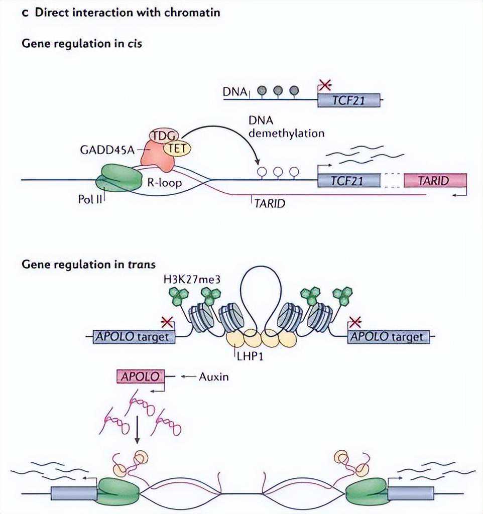 在其他基因座上,顺式作用的lncRNAs可通过直接或间接与靠近其转录位点的染色质相互作用,促进染色质的非活性状态。例如,lncRNAANRASSF1在顺式结构中形成的R环将PRC导向其目标,以调节基因表达。在拟南芥中,低温在开花位点环境诱导的lncRNACOOLAIR在其转录位点徘徊,并覆盖该位点以促进PRC2依赖的H3K27me3。