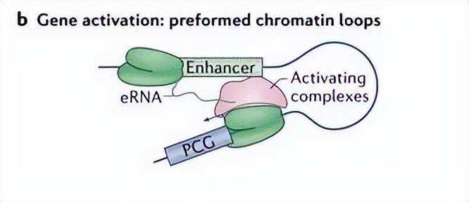 活性增强子可以转录成两种主要的非编码RNA:eRNAs和增强子相关的lncRNAs(elncRNAs)。这两组转录本的主要区别在于它们的特征:eRNAs是相对较短的双向封顶转录本,通常为无片段、非聚腺苷酸化和不稳定的。相比之下,elncRNAs大多是单向、多聚腺苷酸化和拼接的。这两种转录本类型之间的区别并不总是明确的,它们在文献中可能会混淆。尽管增强子活性和eRNAs表达之间的相关性已经很好地确定,但eRNAs转录本本身是否具有功能仍在争论中。然而,一些eRNAs在功能上与基因表达有关。除了通过预先存在的染色质构象发挥作用(图3b),