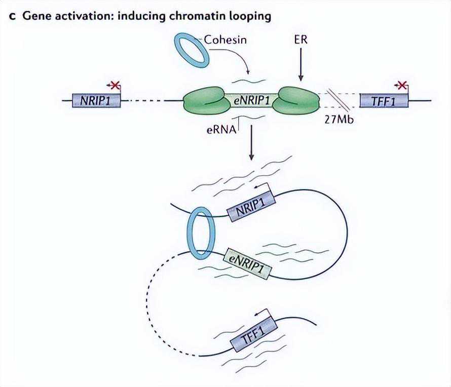 一些eRNAs还可以通过与支架蛋白(如介体或染色体复合体的结构维持)相互作用促进或直接驱动染色质循环。这些相互作用在增强子和启动子之间产生调节性接触,这些增强子和启动子可以定位在可相隔数个兆基的位置(图3c)。