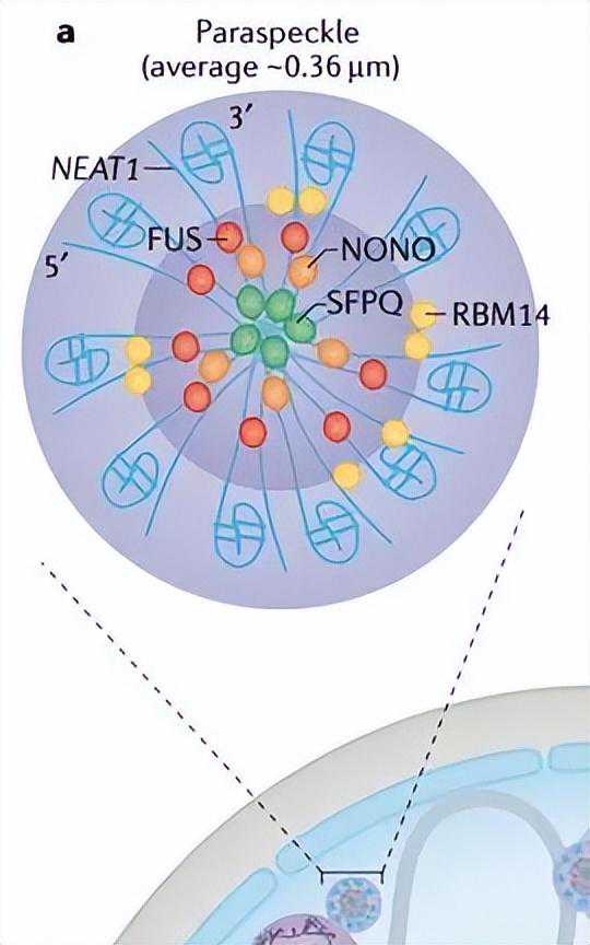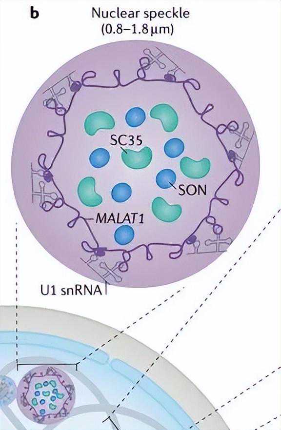 lncRNAMALAT1可能是大多数培养细胞中最丰富的lncRNA。它特异性定位于核斑点,在mRNA前体剪接和转录中发挥重要作用,并参与癌症进展和转移。尽管MALAT1与许多蛋白质相互作用,但MALAT1的缺失并不影响核斑点的形成,而是导致其成分的缺陷。每个核斑点是一个多层隔室,其中核斑点蛋白如剪接因子SON和SC35(也称为SRSF2)位于中心,MALAT1位于外围(图4b)。
