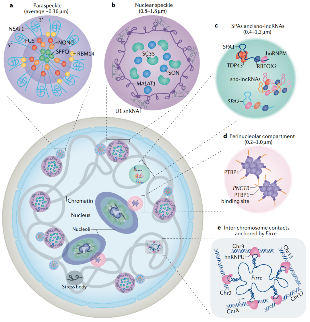 总之,lncRNAs的核定位和命运在多个层面上受到协调调控,从转录和加工到核输出,通过顺式中的多个序列基序和反式中的因子。除了与染色质相连外,一些核保留的功能性lncRNAs特别定位于无膜核结构域(见下文)。尽管这种类型的最具代表性的lncRNAs是通过不寻常的生物发生途径处理的,但在特定的核结构域中捕获这种lncRNAs的分子机制仍然基本未知。尽管如此,鉴于lncRNAs的不同形式、大小和功能(表1),有必要开展更多的工作来剖析控制lncRNAs不同核定位模式的机制的区别和共性。