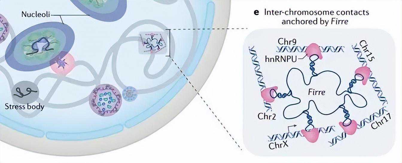 除了在核凝聚物上作为蛋白质和RNA的脚手架外,lncRNAs还可以使不同的染色体在核区域接近。FIRRE由许多从X染色体转录的RNA变体组成;它与核基质因子hnRNPU相互作用,通过其脚手架功能维持核结构域(图4e)。