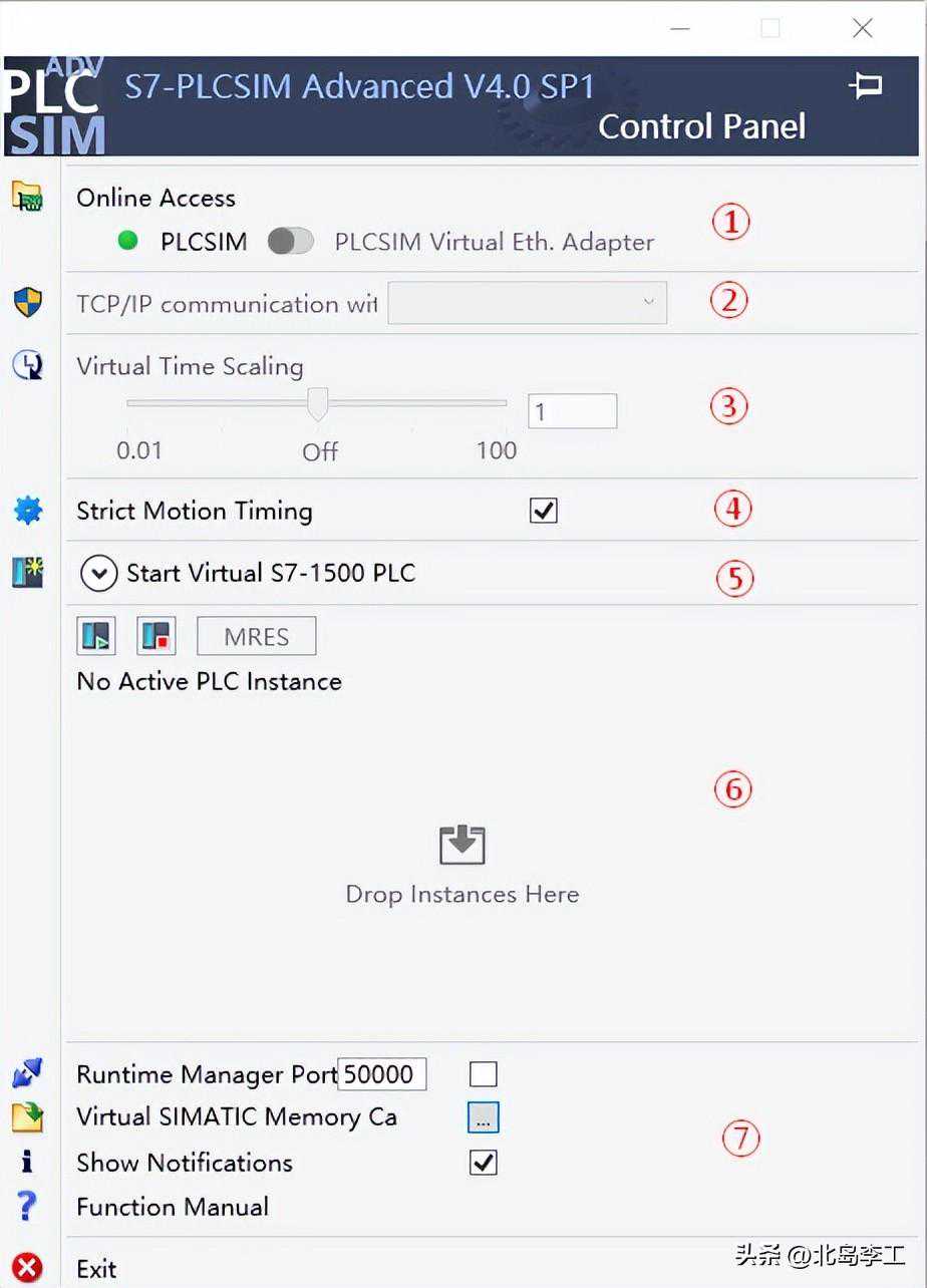 ①设置仿真实例的在线访问方式,有两种:“PLCSIM”使用本地总线访问CPU实例(仅能在同一台电脑内部使用),“”是通过虚拟网卡,以TCP/IP协议的方式访问CPU实例。使用后者必须在安装软件时勾选NPCap(4.0版本使用,早期使用WinPCap);